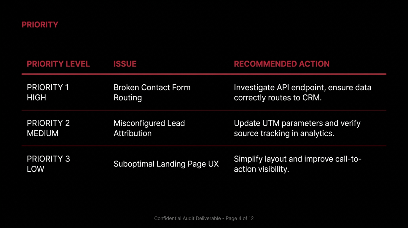 Issues ranked, plain-language actions (as in live audit PDFs: SEO, forms, consent).